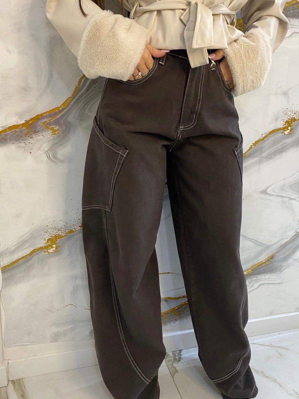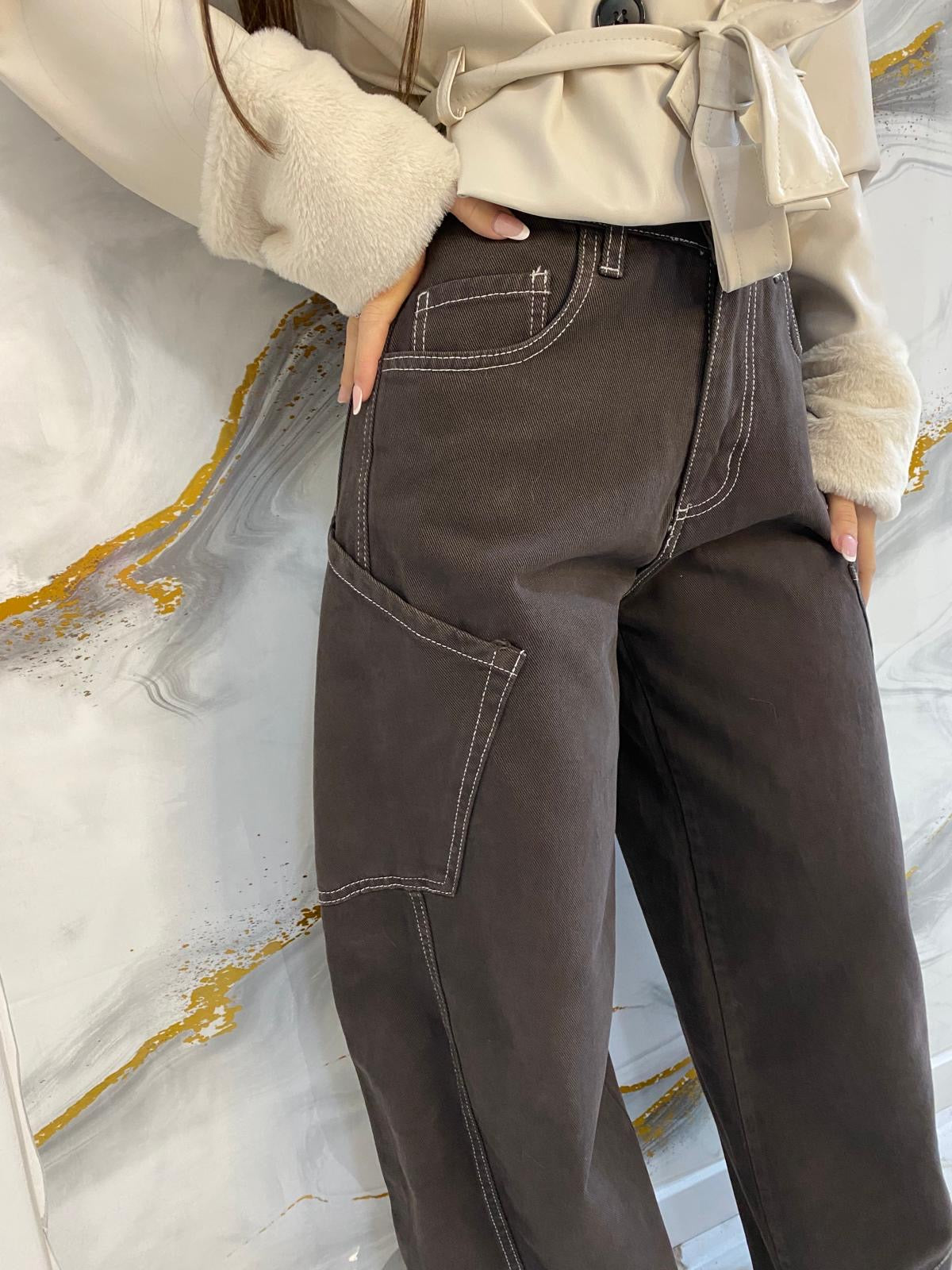 Jeans ballon marrone con cuciture bianche