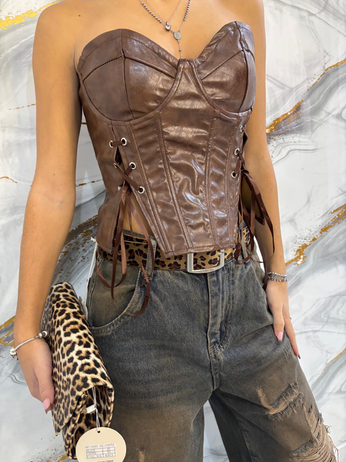 Corpetto in ecopelle, con chiusura a reggiseno ed aperture laterali
