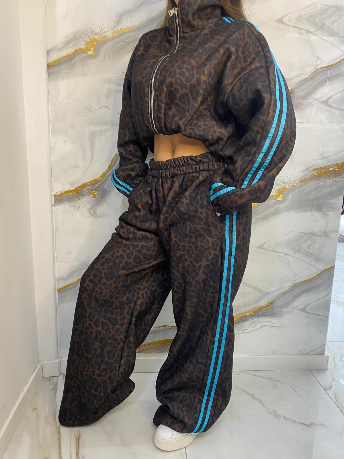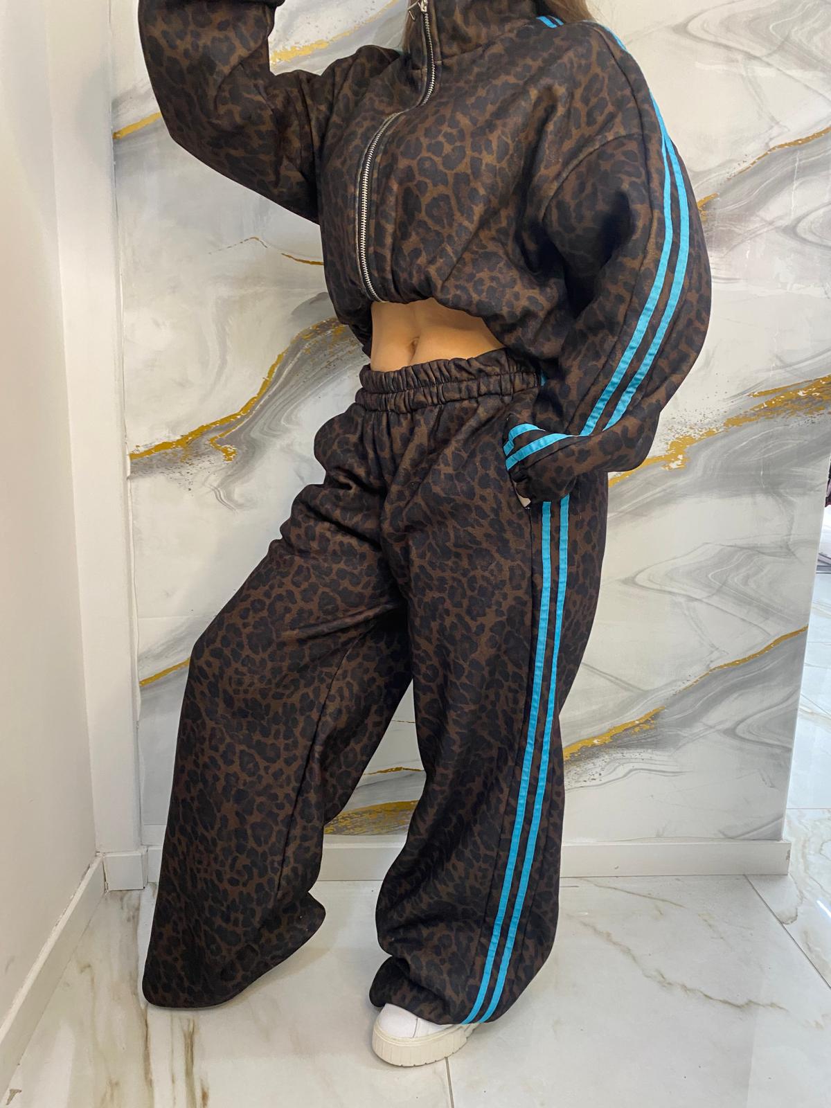 Tuta leopardata: Pantalone a palazzo e felpa con zip